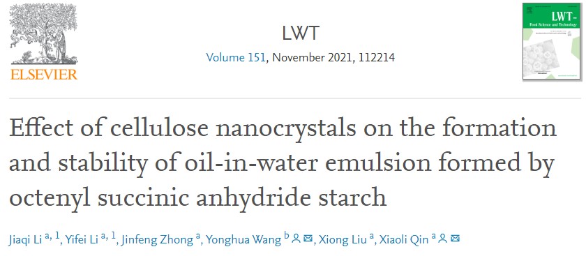 此外,富含不饱和脂肪酸的油脂存在水溶性差、生物利用率缺点,通过纳米技术获得功能性油脂纳米乳液是提高油脂生物利用度的有效途径之一。通过理论计算研究组分之间的相互作用,为从分子水平阐明乳液的形成与稳定机理提供理论支撑,相关成果发表在国际期刊LWT-Food Science and Technology。结果表明,当纤维素纳米晶与淀粉酯(质量比为2∶8)和亚麻籽油的浓度分别为1.5 wt%和10 wt%时,形成相对稳定的Pickering乳液。较强的分子间相互作用(静电作用)有利于形成更稳定的纤维素纳米晶-淀粉酯复合物。这种相互作用可能对以纤维素纳米晶为稳定剂和淀粉酯为乳化剂制备的Pickering乳液的稳定性有一定贡献。