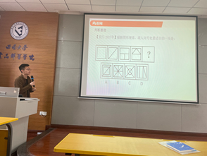 活动第二阶段,邓老师举例了往年重庆各区的录取分数情况,带领同学们一起分析探讨,告诉同学们要认清自己、定好目标。在此过程中,老师选取了一些考公经典例题 ,就如何做出理性判断、如何结合材料多角度分析问题、如何运用材料内容做好题等问题做了具体的示范。同时还给同学们推荐了一些与考公相关的资料查询网站。