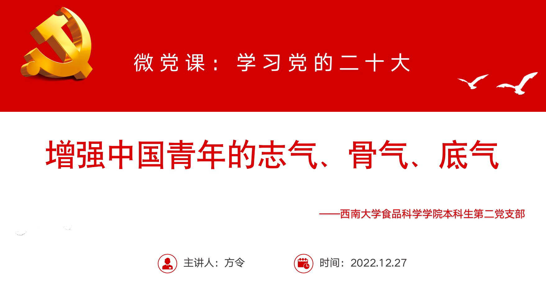 2022年12月27日下午,beat365中国唯一官网本科生第二党支部以腾讯视频会议方式开展了“学习贯彻党的二十大精神,增强建设特色鲜明世界一流大学的使命担当”主题党日活动,西南大学食品科学学院本科生第二党支部书记方令同志在这次大会上给大家讲了一堂关于“增强中国青年的志气、骨气、底气”的微党课,生动形象的向大家阐述了如何做一名符合时代发展的“中国青年”。