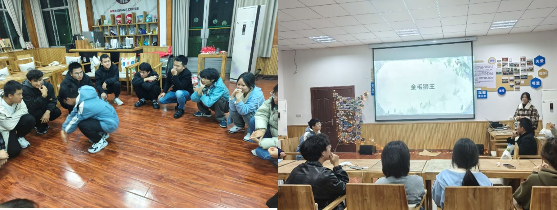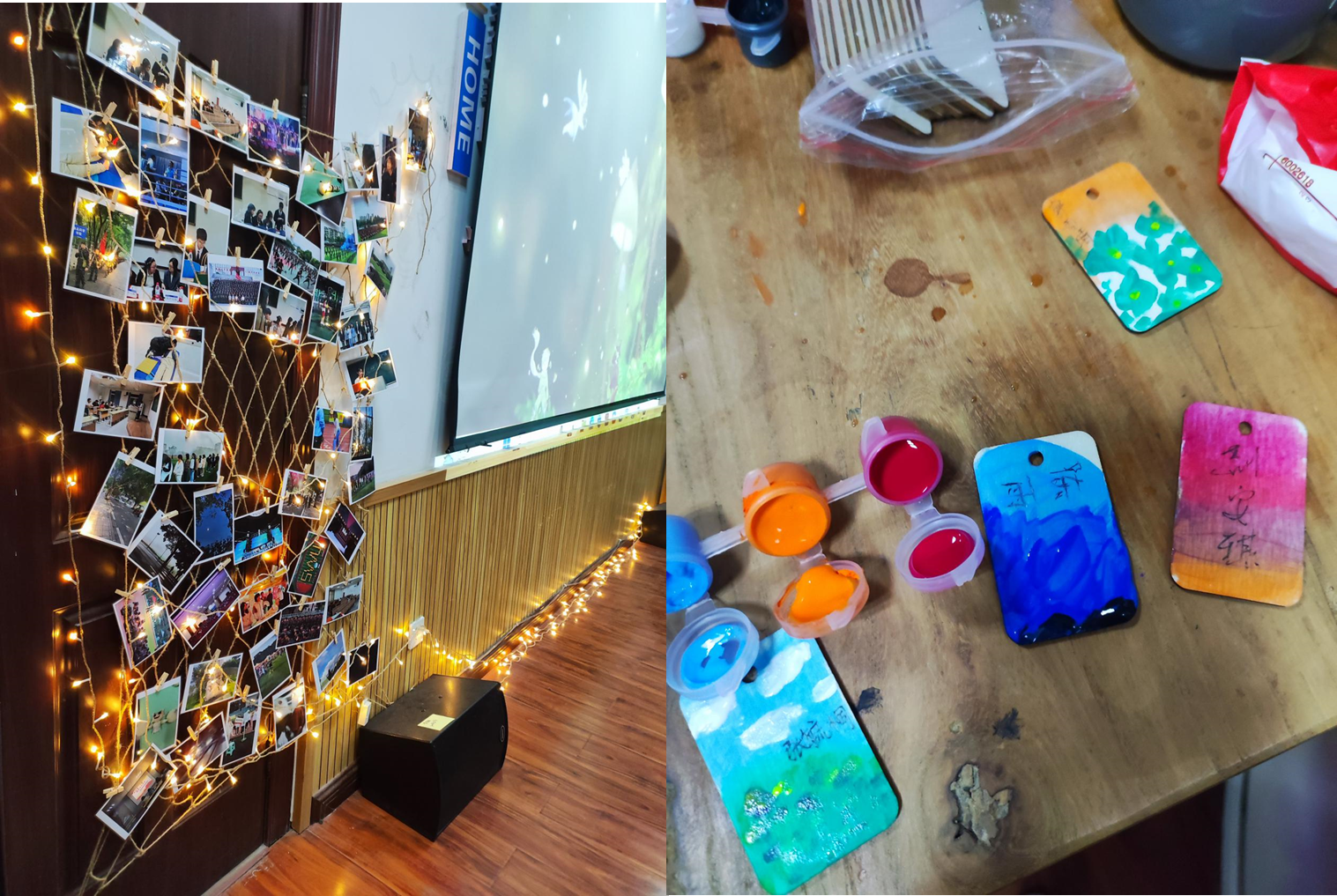 在活动开始之前,班委们一起动手布置场地,精心制作班级照片墙。并在活动之初给每位同学都发放签到卡,让同学们用颜料作画当做签到卡背景,然后签上自己的姓名,用细绳挂于照片墙的中心。整个活动过程中高潮迭起,“踩报纸”“你画我猜”“可怜的小猫”等互动小游戏也让同学们欢声笑语不断。