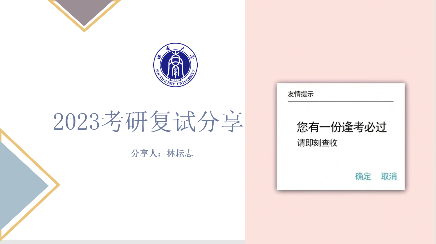 持续“经验分享会”,做好就业升学的“领航员”。2023年3月,在线上进行了就业和考研复试专场分享会。就业会场邀请了在涪陵榨菜集团、中国农业银行、江西省赣州市寻乌县长宁镇人民政府工作的往届毕业生宣讲。3位往届毕业生从备考、简历制作、面试、选岗、主要工作内容等多个方面进行了分享。考研复试会场邀请了目前就读于中国农业大学、西南大学等高校的4名研究生进行宣讲,他们主要围绕复试流程、复试内容、注意事项等方面进行了分享。