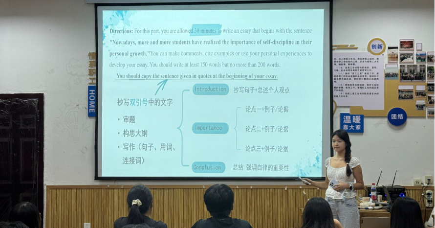 在经验分享环节,两位同学依次分享高分秘诀,倾囊相授备考“干货”。丁雨萌同学详细讲解了如何制定科学合理的备考计划。她建议将备考周期划分为基础夯实、专项突破和模拟冲刺三个阶段,并合理分配每日学习时间,同时在词汇积累方面,她分享了自己的“碎片化学习法”。