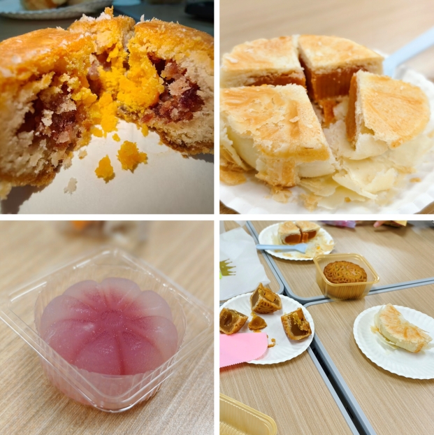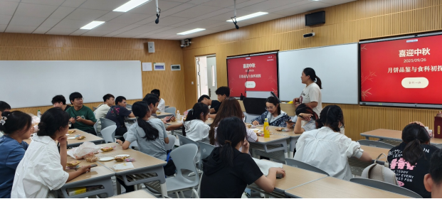 随后,活动进入月饼品鉴与科普环节。由班委为同学们详细地介绍了广式、苏式、冰皮等不同月饼的饼皮特点及制作工艺,广式月饼的糖浆皮薄馅大,苏式月饼的酥皮层次分明,冰皮月饼的软糯清凉,让同学们在味觉体验中直观感受食品工艺的差异。并结合食品科学知识,讲解了山梨酸钾等食品添加剂的作用,用轻松幽默的语言解释了防腐剂在食品保鲜中的重要地位。同学们在品尝各类月饼的同时,也学习了其背后的科学原理,实现了“品”与“学”的结合。