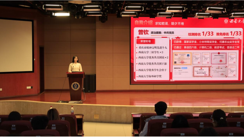 曾钦以“不负韶华,青春不留白”为主题,分享了自身在专业学习、科研竞赛、社会实践中的成绩与感悟,鼓励同学们勇于探索、脚踏实地,将青春理想转化为实际行动。