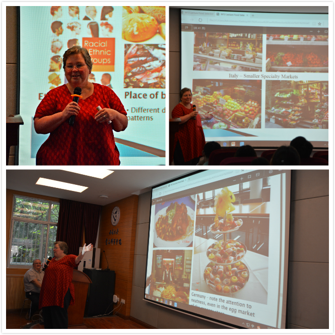 接下来,Delores Heisserer Chambers教授向同学们介绍了关于不同国家和文化的食物特点和饮食习惯,展示了德国、日本、西班牙、泰国等世界众多国家的饮食文化和食品特色,分析了造成各国饮食差异的影响因素,同时为同学们品尝国外美食提供了个人建议。Delores Heisserer Chambers教授的精彩介绍赢得了阵阵掌声,给在场同学打开了一扇了解世界美食的窗口。